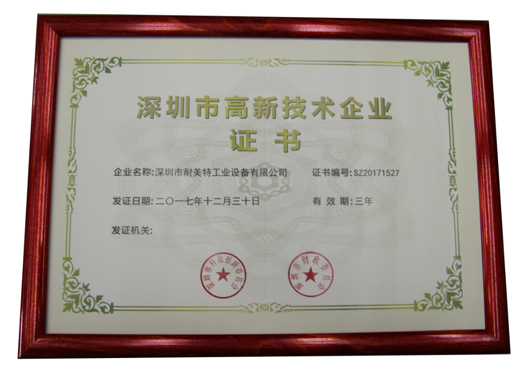 2018年伊始,深圳耐美特工业设备有限公司喜迎佳音——根据国家《高新技术企业认定管理办法》和《高新技术企业认定管理工作指引》的相关规定,耐美特工业设备被认定为国家级高新技术企业。近日,公司也已收到了由深圳市科技创新委员会、深圳市财政委员会、深圳市国家税务局、深圳市地方税务局联合颁发的“国家高新技术企业”认定证书,由此正式迈入国家高新技术企业行列。